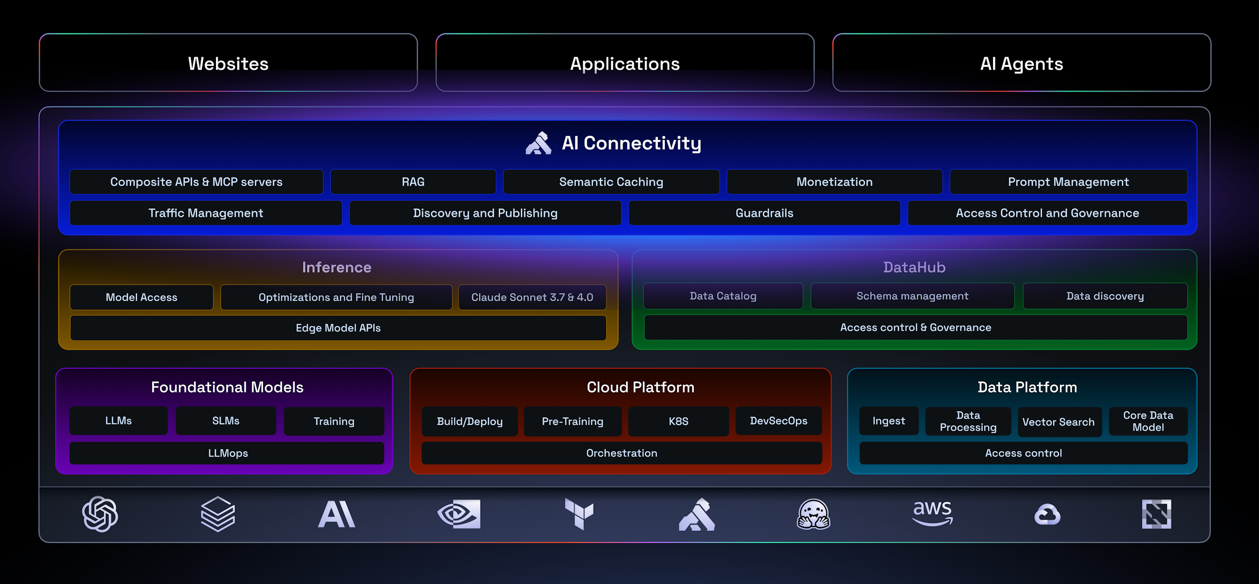 APIプラットフォームを構築するための最も戦略的な足がかりは、トラフィックレイヤーという「山脈の要所(マウンテン・パス)」を押さえることである、というのが私たちの長年の信念です。クラウドネイティブの世界ではAPIゲートウェイがそのブローカー技術でした。しかしエージェントの世界では、AIゲートウェイがAPIとモデル間のトラフィックを制御する次世代のコネクティビティブローカーとなります。AIトラフィックは従来の1,000倍以上の規模、すなわち「マシン・スケール」へと拡大します。