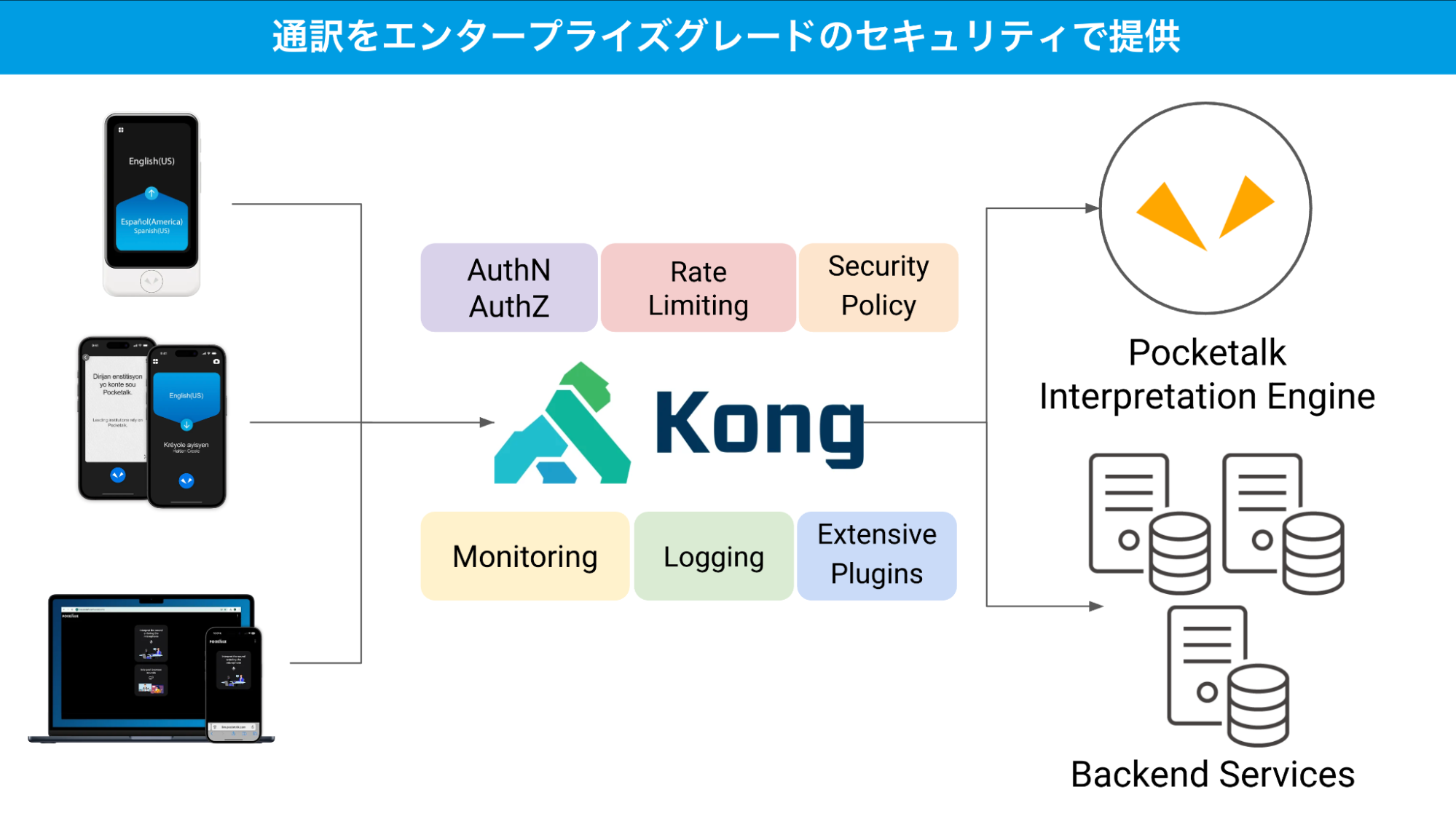 本採用は、ポケトークがより一層法人(BtoB)向けビジネスを強化する中で、複数製品や外部パートナー企業との連携を安全かつ効率的に実現するための取り組みの一環として実施されました。Kongの採用により、認証・認可、アクセス制御、ロギング、トレーサビリティなどを統合的に管理できる、エンタープライズグレードの共通API基盤を構築しています。